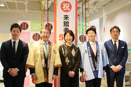 鳥取、岡山両県は13日、東京・新橋の共同アンテナショップ「とっとり・おかやま新橋館」の来館者が500万人に達したことを記念し、館内でセレモニーを開いた=東京都港区 【時事通信社】