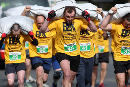 6日、英中部ブラッドフォード近郊の村で開催された「世界石炭運び選手権」の参加者。石炭が詰まった袋を運ぶ速さを競うレースは、1963年に村のパブで出会った石炭商と農家の賭けから始まったという。 【EPA時事】