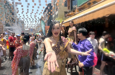 タイで旧暦の元日に当たる13日、「水掛け祭り」として知られる伝統行事ソンクラーンが始まった。首都バンコクの繁華街カオサン通りやシーロム通りでは、市民や観光客が水を掛け合い、例年通りのにぎわいを見せた。 【時事通信社】