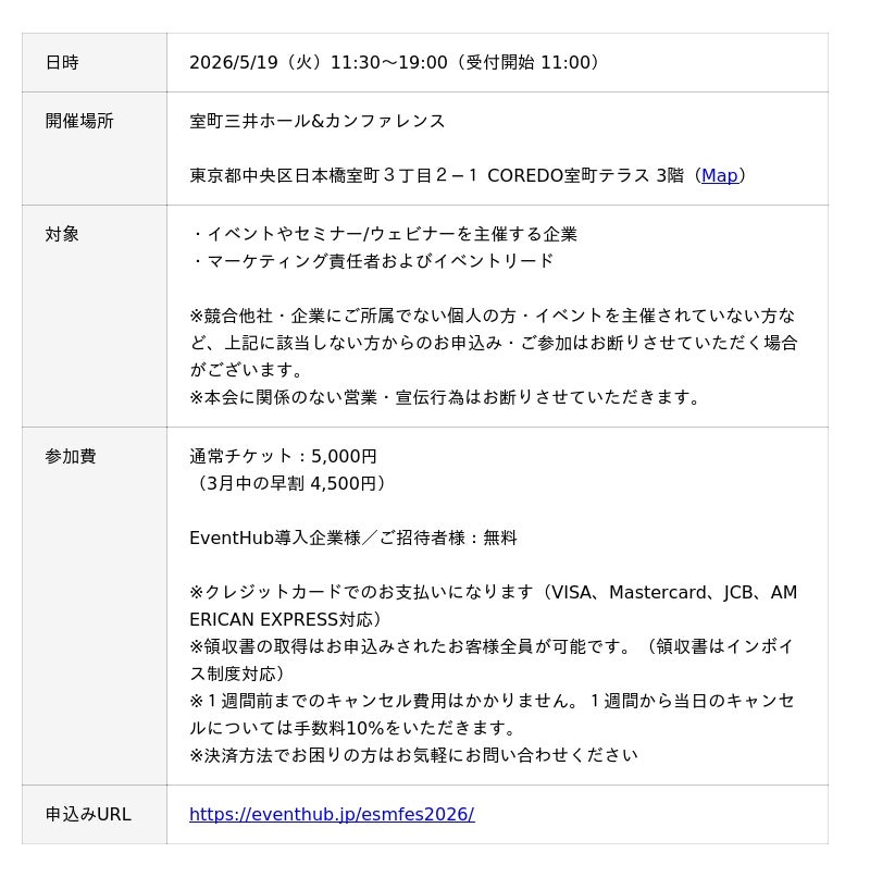 株式会社EventHub(東京都港区、代表取締役CEO:山本 理恵)が提供するシェアNo.1(※)イベント・ウェビナーマーケティングプラットフォーム「EventHub(イベントハブ)」は、5月19日(火)に第2回イベントマーケティングのフラッグシップイベント「Event Seminar Marketing Fes 2026」を開催します。