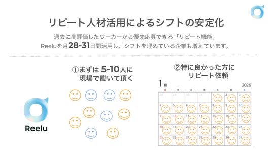 株式会社Reelu(本社:東京都、代表取締役:今野珠優、以下Reelu:リール)は、導入企業の皆様が「またお願いしたい」と感じたワーカーに対し、指名して継続的に依頼をすることができる「リピート指名プラン」の提供を開始しました。業務現場の課題として多い、シフトの不安定さや繁忙期の人員確保に対し、同一人材への継続依頼という選択肢を提供することで、企業の運用負担を軽減し、現場品質の安定に貢献します。